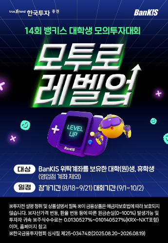 컨텐츠 정보 목록 마감 [한국투자증권]14회 대학생 모의투자 대회 47 0 본문 한국투자증권 기업형태 대기업 참여대상 대학생 시상규모 1,770 만원 접수기간 시작일 2025-08-18 마감일 2025-09-21 홈페이지 https://securities.koreainvestment.com/main/customer/notice/Event.jsp?gubun=i&cmd=TF04gb010002¤tPage=1&num=6371 활동혜택 입사시 가산점, 상장 수여 활동분야 기타 추가혜택 참가고객 모두 랜덤쿠폰 지급 공유하기 홈페이지 지원 상세내용 지원서 다운로드 첨부 지원서 파일 없음 담당자 정보 담당자 한국투자증권 연락처 이메일 댓글 0 등록된 댓글이 없습니다. 로그인한 회원만 댓글 등록이 가능합니다. 목록